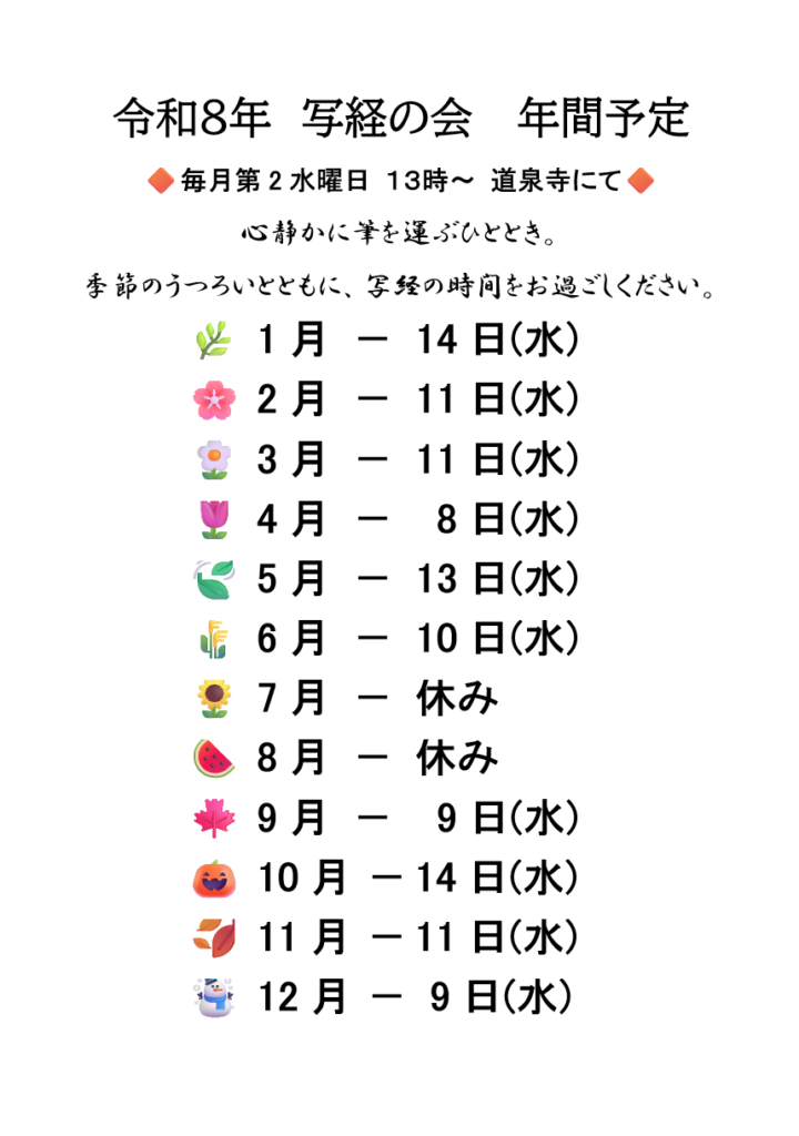 毎月第2水曜日の13時~写経の会をおこなっております(7月8月は除く)
